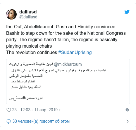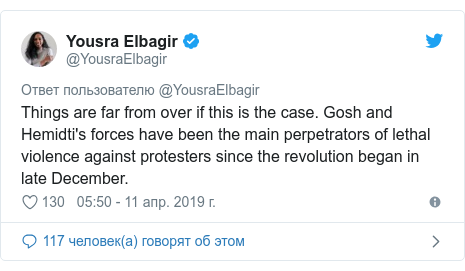 По словам известной в Судане журналистки Юсры Эльбагир, "замена одной диктатуры на другую" не удовлетворит протестующих. Глава разведки Судана Салах Гош и руководитель сил быстрого реагирования (проправительственных отрядов "джанджавид") Мохаммад Хамдан Даало ("Хамидти") управляли жесткими действиями против демонстрантов, написала она в "Твиттере".