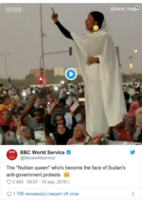 Одним из символов народного движения протеста стала Алаа Салах - "женщина в белом", неоднократно выступавшая перед толпой в Хартуме. Видео с ней распространилось по сотням тысяч аккаунтов в "Твиттере". В прессе она получила прозвище "Нубийская королева".